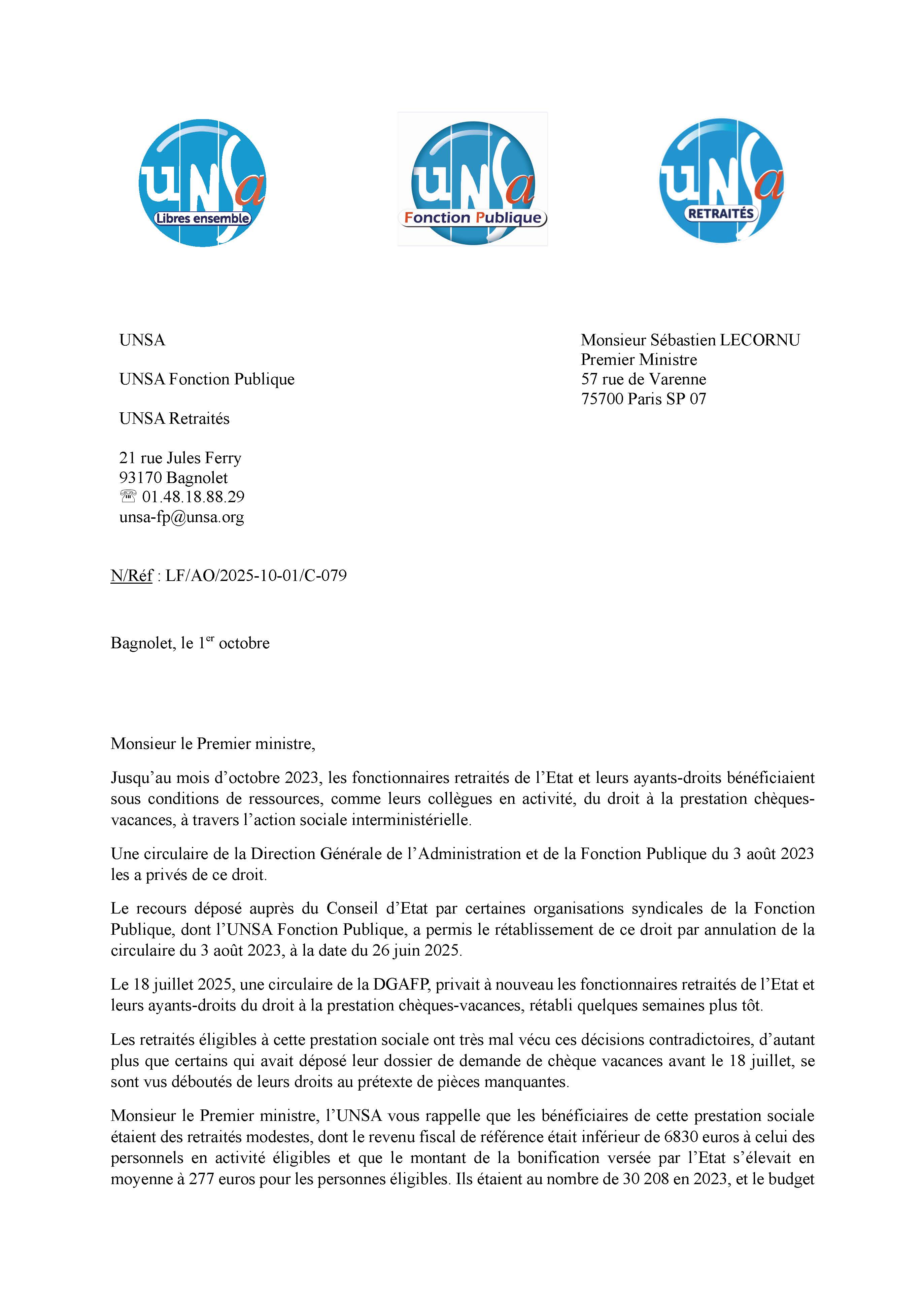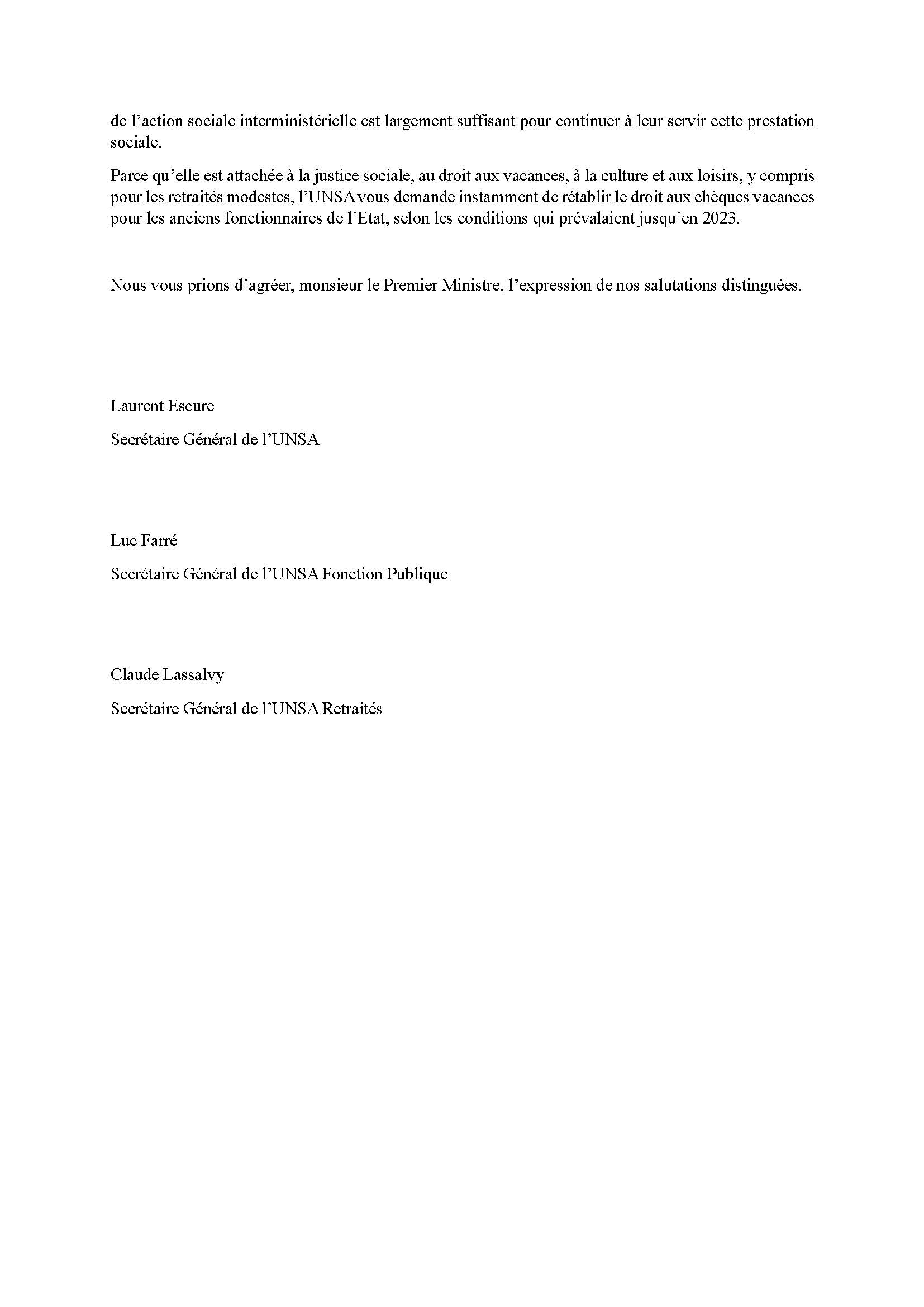 Parce qu’elle est attachée à la justice sociale, au droit aux vacances, à la culture et aux loisirs, y compris pour les retraités modestes, l’UNSA vous demande instamment de rétablir le droit aux chèques vacances pour les anciens fonctionnaires de l’État, selon les conditions qui prévalaient jusqu’en 2023.