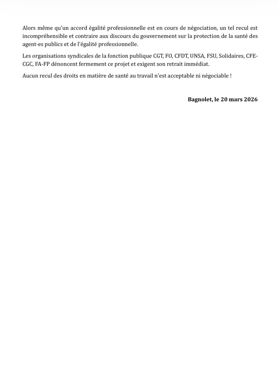 Alors même qu’un accord égalité professionnelle est en cours de négociation, un tel recul est incompréhensible et contraire aux discours du gouvernement sur la protection de la santé des agent·es publics et de l’égalité professionnelle.